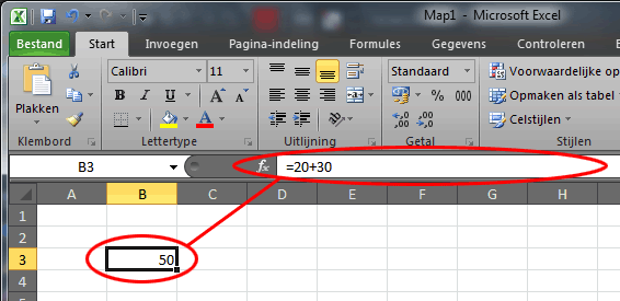 Het lijkt alsof er in cel B3 het getal 50 staat. Als je naar de formulebalk kijkt, zie je dat er een berekening in staat, namelijk 20+30.