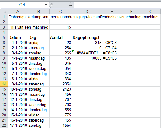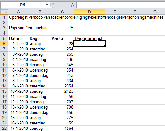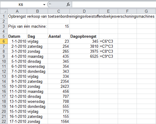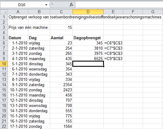 In cel D6 t/m D95 komen formules te staan die uitrekenen hoeveel geld er per dag verdiend is aan de toetsenbordreinigingsvloeistoffendoekjesverschoningsmachines. Één machine kost € 15,-. Dan is er op 1-1-2010: 23 x € 15,- verdiend.