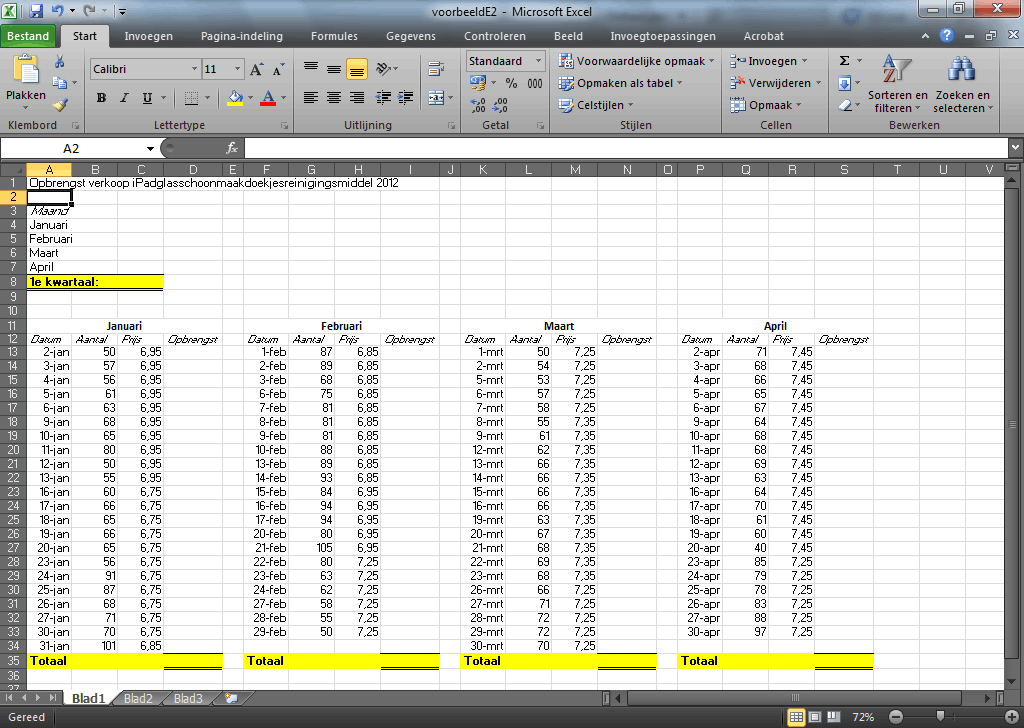 Vaak zie je dat Excel gebruikt wordt voor administratie van een bedrijf. Er zijn heel veel gegevens en heel veel berekeningen. Om dit overzichtelijk te maken, wordt er vaak een kleine tabel gemaakt, waarin de resultaten bij elkaar gezet worden. Als voorbeeld gebruik je het bestand VoorbeeldE2.xlsx