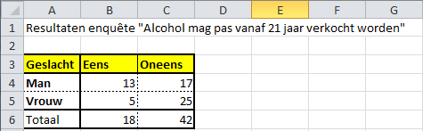 Je hebt een enquête gehouden over de stelling "Alcohol mag pas vanaf 21 jaar verkocht worden". Je hebt 60 mensen ondervraagd. Hieronder zie je de resultaten.