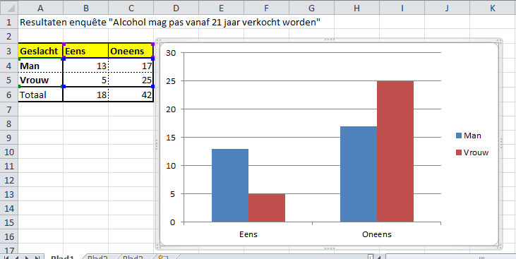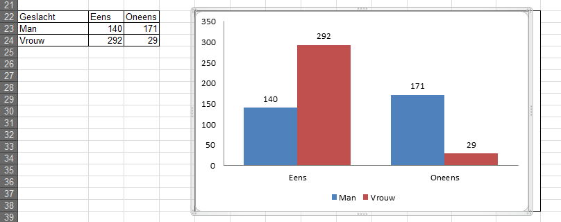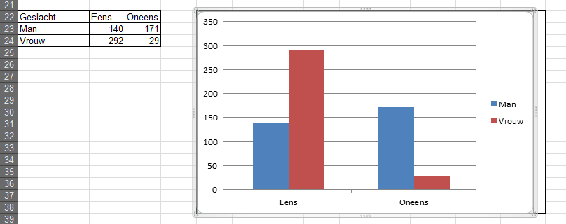 Een kolomdiagram hoeveel mannen/vrouwen het eens en oneens zijn met de stelling.