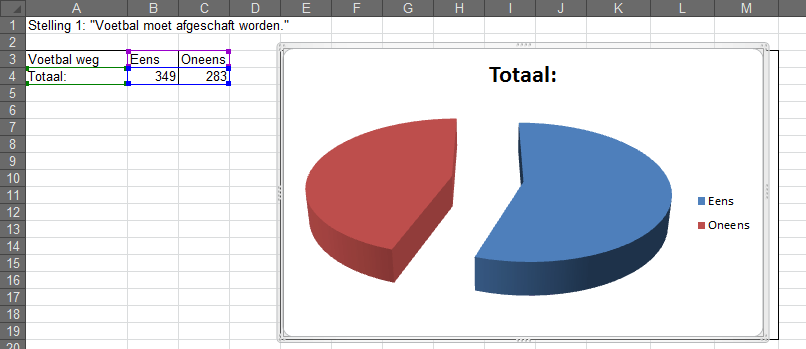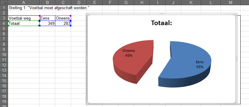 Een cirkeldiagram hoeveel procent van de mensen het eens en oneens zijn met de stelling.