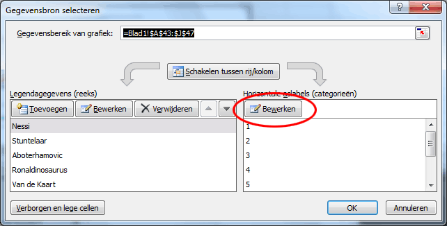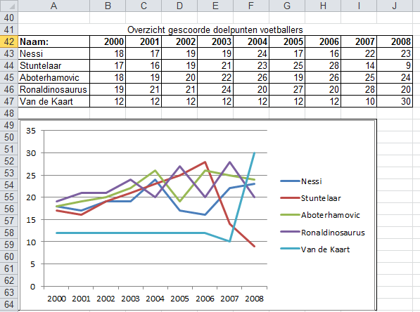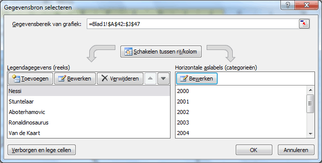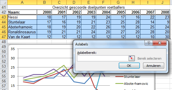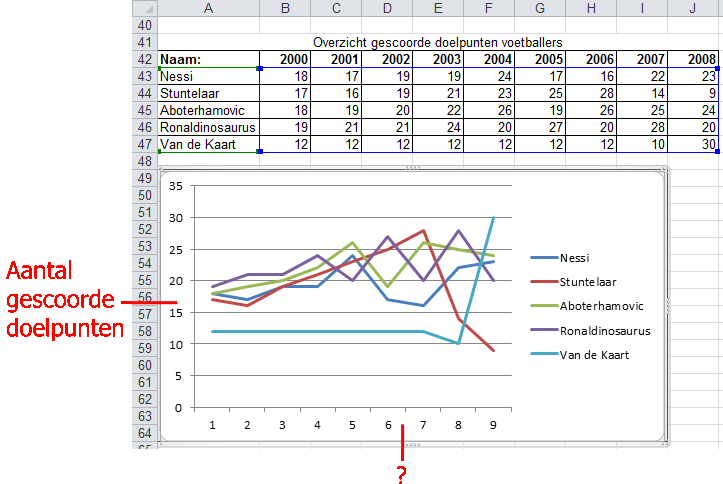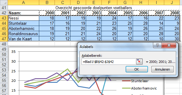 In het linkerscherm (1) zie je de namen van de voetballers. In het rechtergedeelte (2) zie je alleen maar getallen. Hier komen de jaartallen te staan. Door de knop Bewerken te klikken, kun je de benodigde gegevens uit de tabel zelf halen.