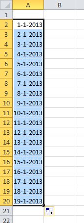 Als je in cel A1 de datum 1-1-2013 zet, kun je met de vulgreep ineens heel veel data tegelijk in de cellen eronder zetten.